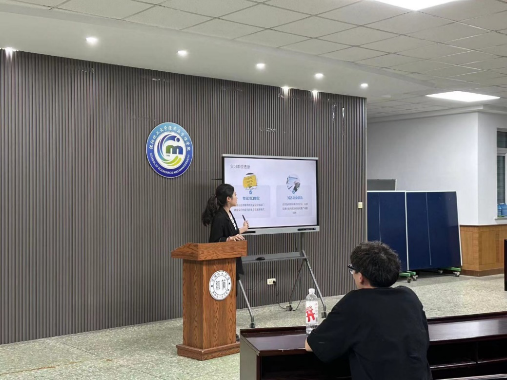 在分享交流活动中,工程管理专业吴晓港同学分享了自己的实习实践经验,他引用寓言故事强调在实习工作过程中要善于表达自己和认识自己,介绍了专业型硕士研究生的培养方案并提出了实习建议。向同学们展示了在实习过程中的注意事项,包括了解自己的目标,根据目标制定计划,并在面对诱惑时如何抵制以防被诈骗等。
