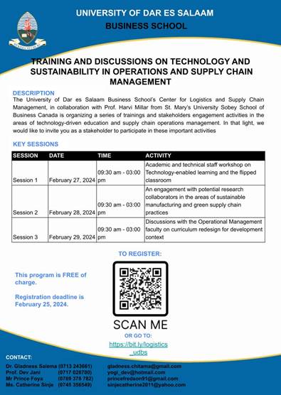 2024年2月27日至2月29日,刘研华和马坤老师参加了达累斯萨拉姆大学商学院可持续运营中心组织的关于供应链管理运营技术和可持续发展系列讲座。讲座由加拿大圣玛丽大学索比商学院Harvi Millar教授主讲,主要围绕技术驱动型教育和供应链管理进行。主要内容如下: