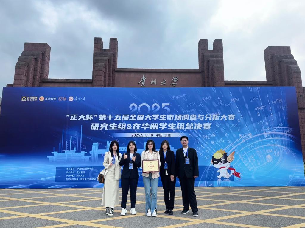 近日,第十五届全国大学生市场调查与分析大赛研究生组及在华留学生组总决赛于贵州圆满收官。作为国内市场营销与统计学领域的顶级赛事,本次大赛吸引了全国1184所高校、超34万名学子踊跃参与,其中研究生与留学生赛道汇聚589所高校同台竞技。在这场高规格赛事中,我校beat365中国官方网站参赛团队凭借深厚的专业功底与卓越的协作能力,一举揽获国家级二等奖1项、省级一等奖1项、二等奖2项、三等奖4项,展现出强劲的学科实力。