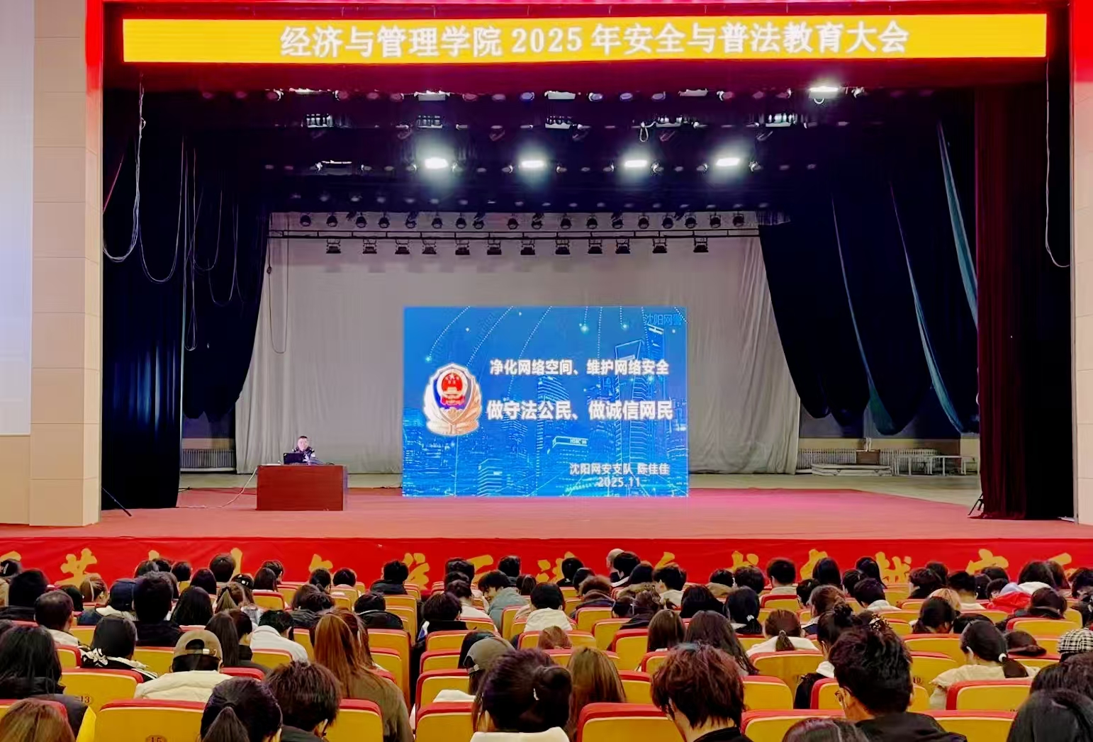 在普法教育环节,沈阳市公安局网安支队民警陈佳佳为师生开展《净化网络空间,维护网络安全,做守法公民,做诚信网民》专题授课。陈警官结合当前网络安全形势,深入阐释了维护网络政治安全和意识形态安全的至关重要性,通过典型案例分析,揭示了利用互联网进行渗透破坏活动的严重危害。陈警官强调,互联网不是法外之地,必须坚决捍卫网上政治安全,聚焦网络反恐与网络信息舆论斗争,广大师生要牢固树立法治观念,自觉抵制网络谣言和有害信息,共同维护清朗网络空间。